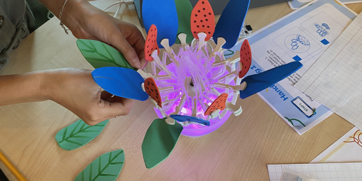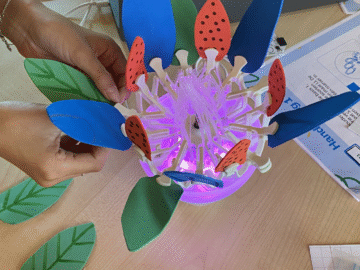 Tijdens hun bezoek werkten de leerlingen aan een ‘challenge’: het bouwen van een bionische bloem. Daarbij leerden ze over biomimicry – hoe techniek de natuur nabootst – en gingen ze zelf experimenteren met vormen, materialen en werking. Elk groepje bouwde uiteindelijk een eigen versie van de bloem, die via de laptop aangestuurd kon worden. “Aan het eind had je vier totaal verschillende bloemen. Dat is precies wat we willen: ruimte voor creativiteit en eigen ideeën.”