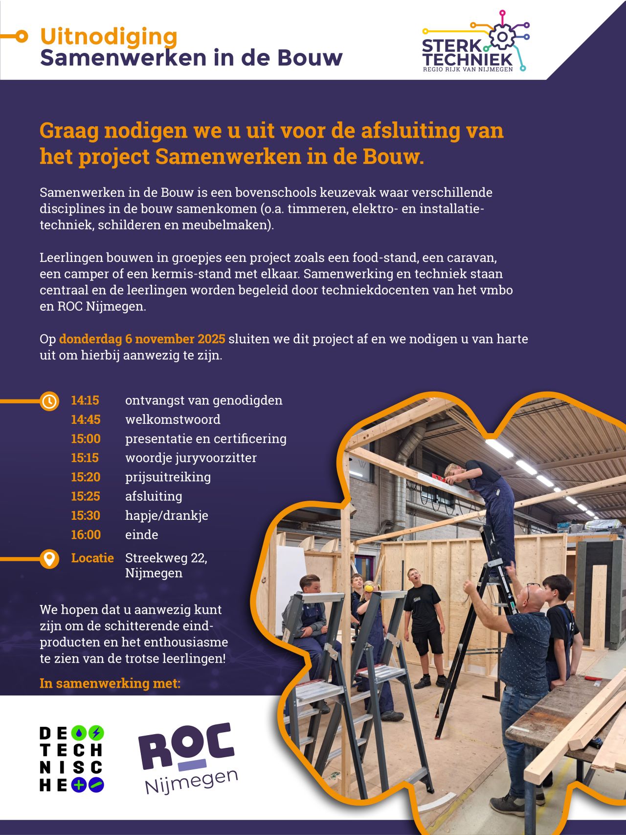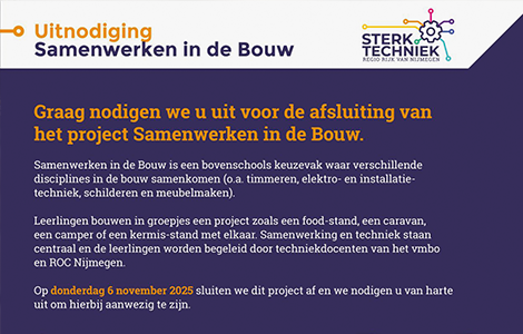 Leerlingen bouwen in groepjes een project zoals een food-stand, een caravan, een camper of een kermis-stand met elkaar. Samenwerking en techniek staan centraal en de leerlingen worden begeleid door techniekdocenten van het vmbo en ROC Nijmegen.