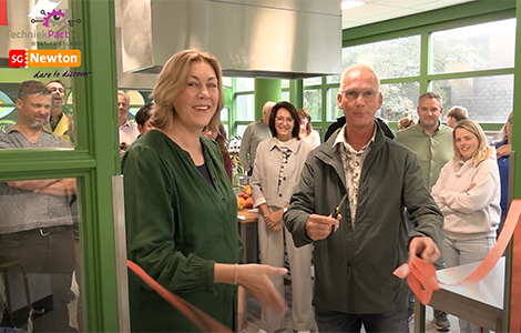 Opnieuw viert het TechniekPact West-Friesland een belangrijke mijlpaal; op woensdag 17 september opende het Foodlab bij sg Newton haar deuren. Na de techlabs en het agri-techlab is dit het vierde ervaringslab in de regio. Als techniekverwante school met het VMBO profiel Dienstverlening en producten heeft zij het dicht bij huis gehouden. In het Foodlab kunnen de bezoekende basisscholen zich dan ook laten inspireren door de wereld van de voedingstechniek. Projectleider Gerben Bakker is duidelijk in zijn nopjes bij het doorknippen van het lint’ ‘Door iedere school in de samenwerking haar technische hart uit te laten lichten is er samenwerking en geen concurrentie tussen de scholen’. De winnaars zijn de basisscholen die ook van dit Foodlab gratis gebruik kunnen maken.
