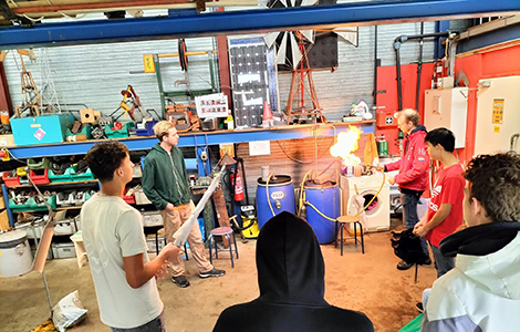 De werkplaats van de WOT is niet geschikt voor instructie aan een grotere groep. Usman: “Wij hebben met plezier de afdeling PIE en onze expertise als techniekdocenten beschikbaar gesteld, zoals lassen, draaien en meer. We hebben aan de studenten van de WOT uitgelegd hoe onze machines werken en zij hebben daar vooral op het vlak van metaalbewerking naar hartenlust gebruik van kunnen maken om hun duurzame technische oplossingen te realiseren.” Ook keken de studenten mee met het soort opdrachten dat de PIE-leerlingen zelf uitvoeren en hoe hun curriculum in elkaar steekt. Lucas en Colin: “Het was heel inspirerend om te zien dat de docenten van CT Stork College zoveel plezier haalden uit het begeleiden van onze groep studenten!”