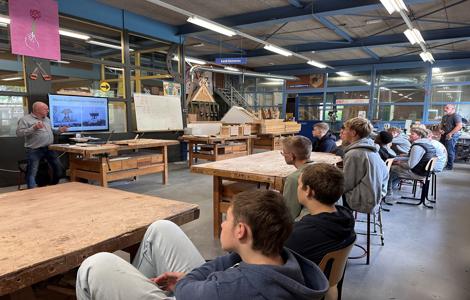 Het is stil in het vaklokaal, de leerlingen luisteren vol aandacht. Ze zien prachtige projecten voorbij komen en krijgen uitleg over wat er allemaal nodig is om te kunnen bouwen. Door de inzet van al die verschillende disciplines ontstaat een gevarieerd aanbod in beroepskeuzes. Kortom voor iedereen is er wel iets te doen in de bouw. Er worden belangstellende vragen gesteld en je kunt merken dat leerlingen oprecht geïnteresseerd zijn!
